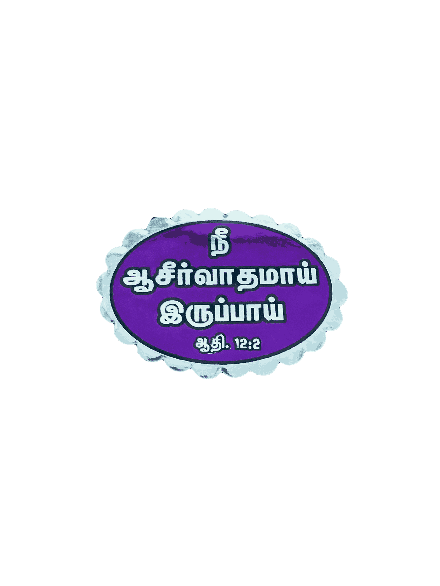 - Design: Set of 12 oval-shaped reflective stickers, each featuring a different Bible verse in Tamil