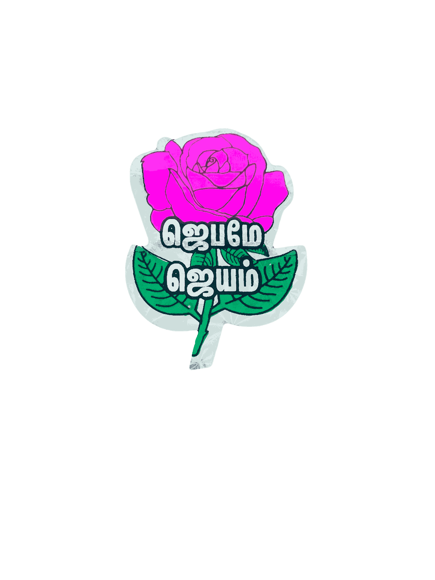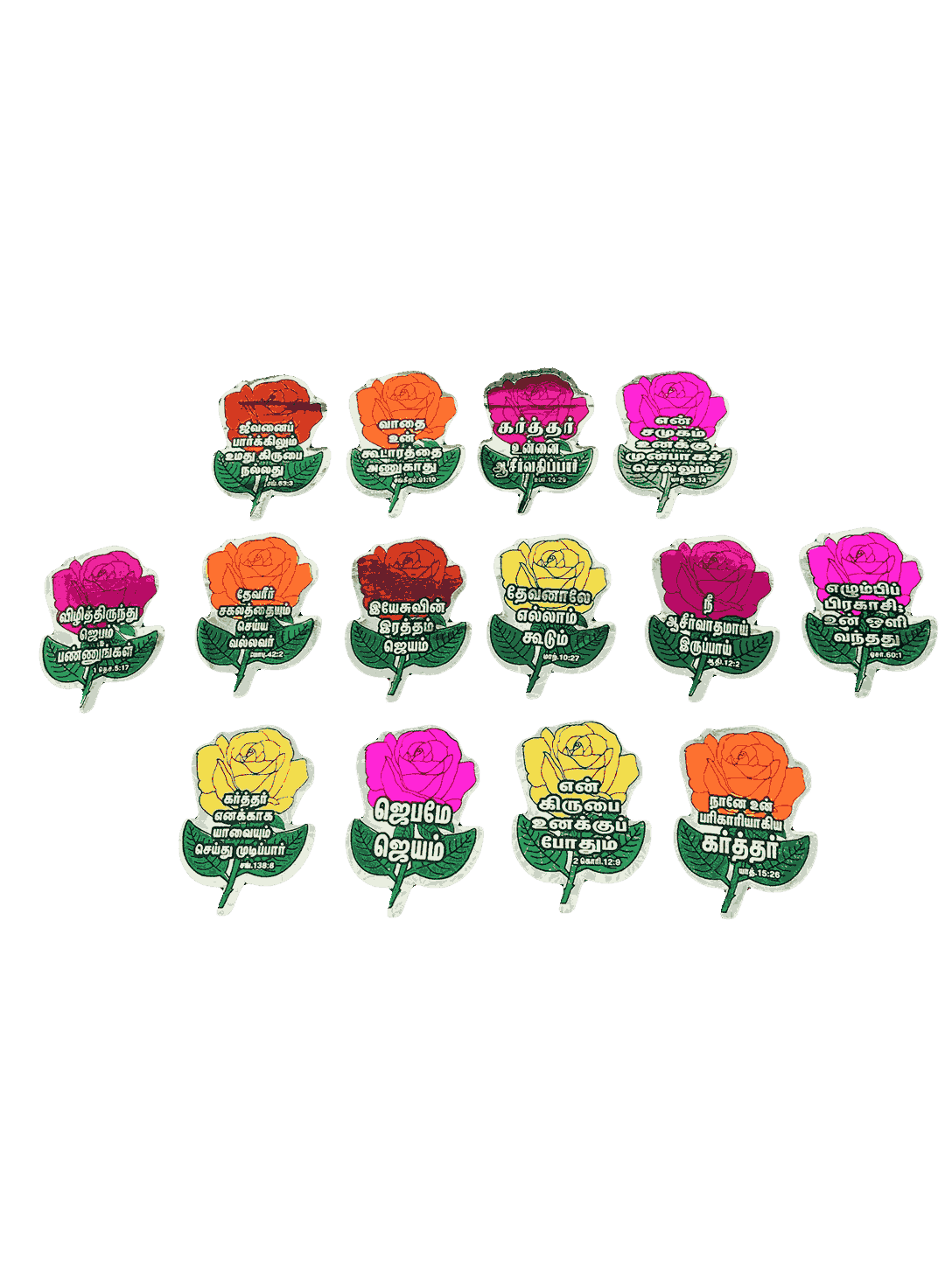 • Set of 15 small round stickers featuring Bible verses in Tamil with rose design