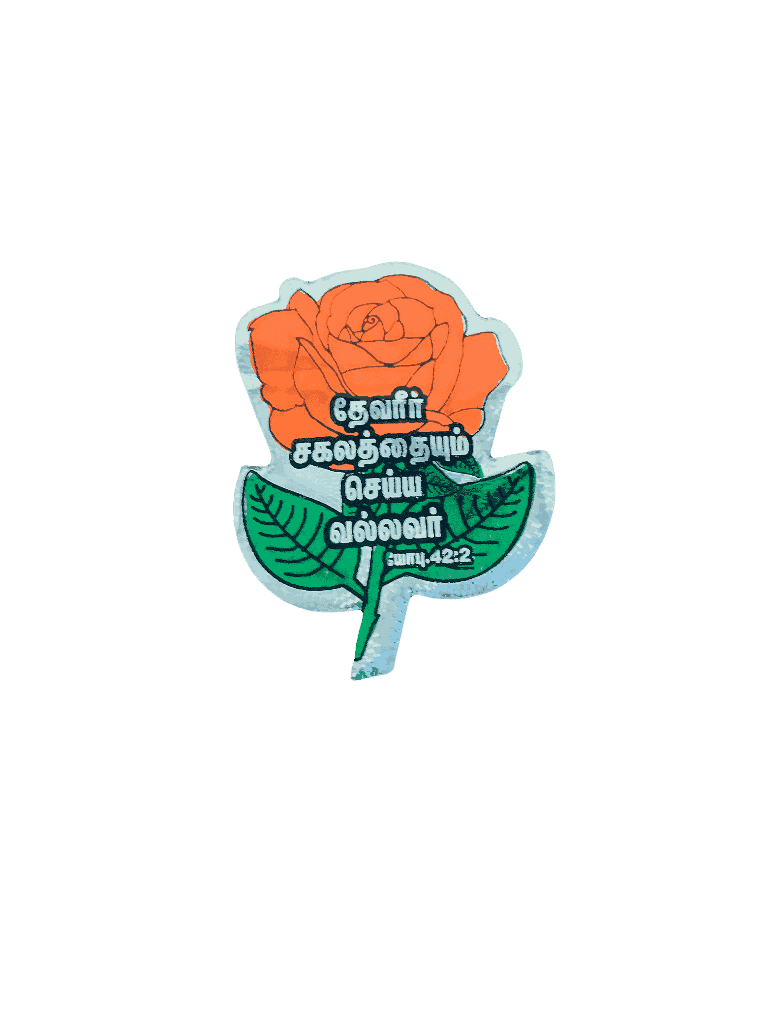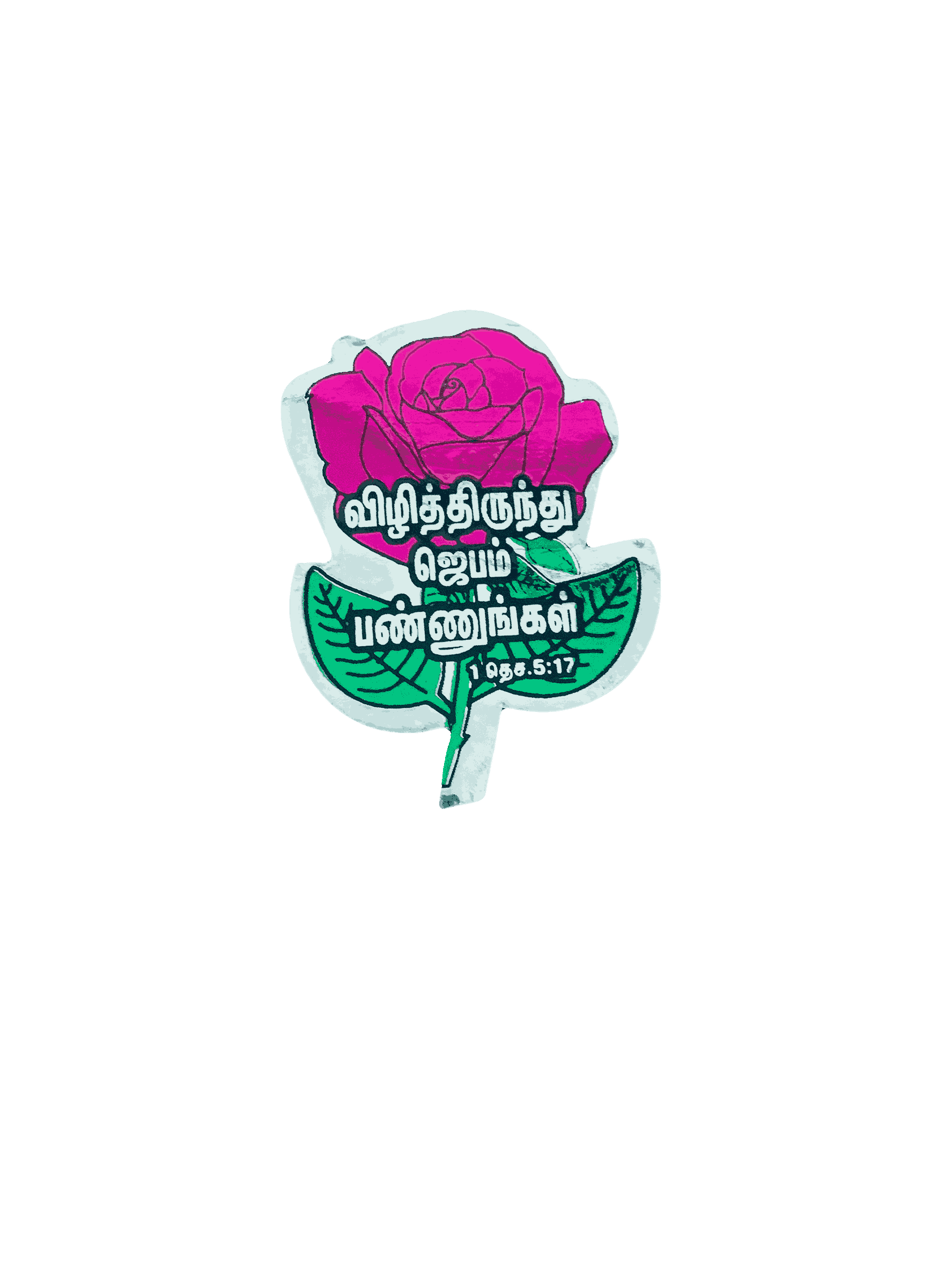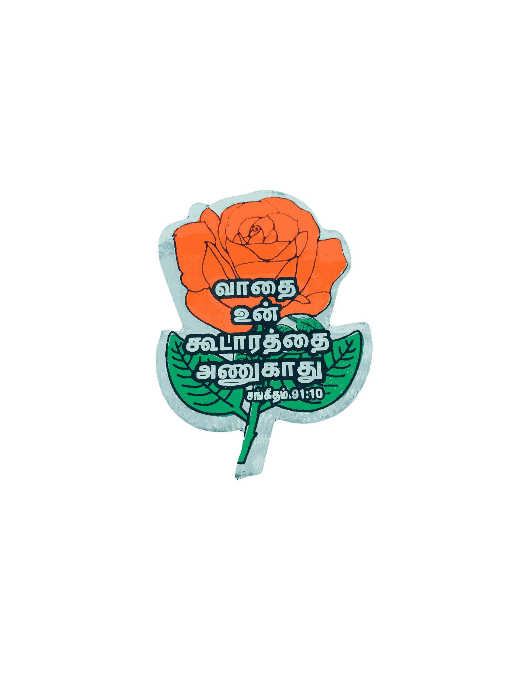 Bring God’s Word to life with the Bible Verses Reflector Stickers Tamil Small Size – 15 Stickers (Rose Model). This set features 15 beautiful round stickers, each showcasing an inspiring Bible verse in Tamil, set against a delicate rose design. Made with reflective material, these stickers serve as both a source of spiritual encouragement and a safety feature, making them visible in low light conditions. Whether you place them on your car, water bottles, or notebooks, they are a unique way to express your faith. The small size and elegant design make them perfect for gifting or for your personal use.