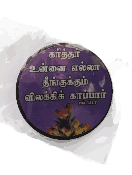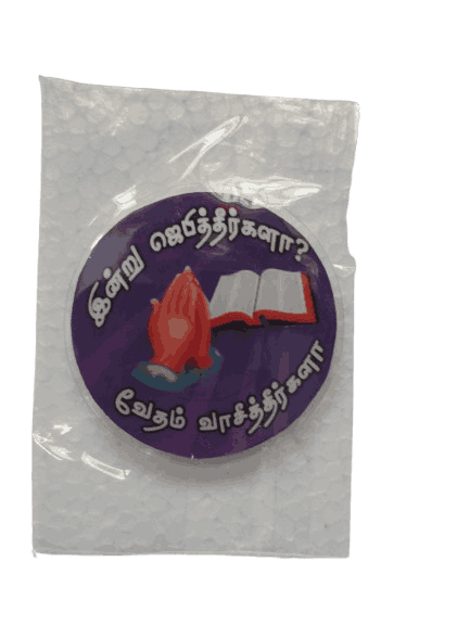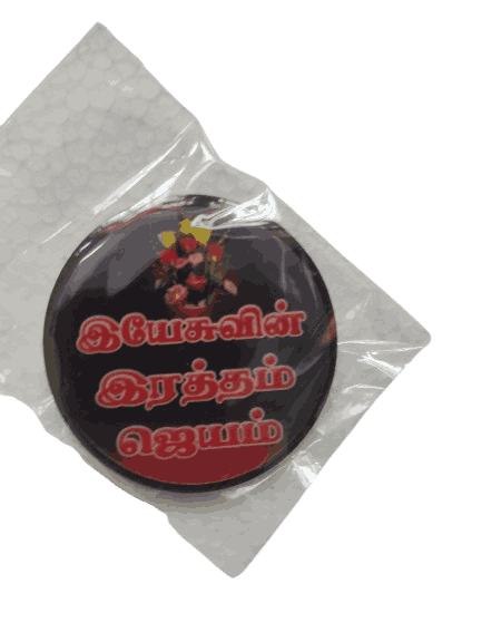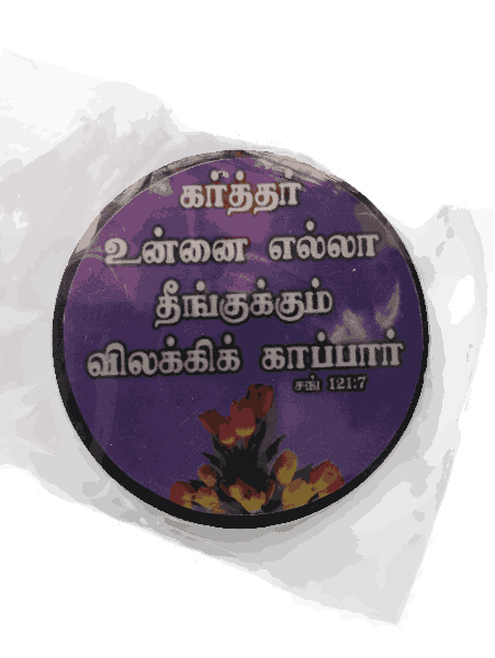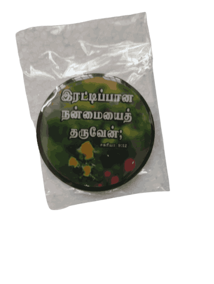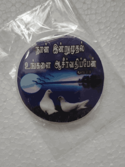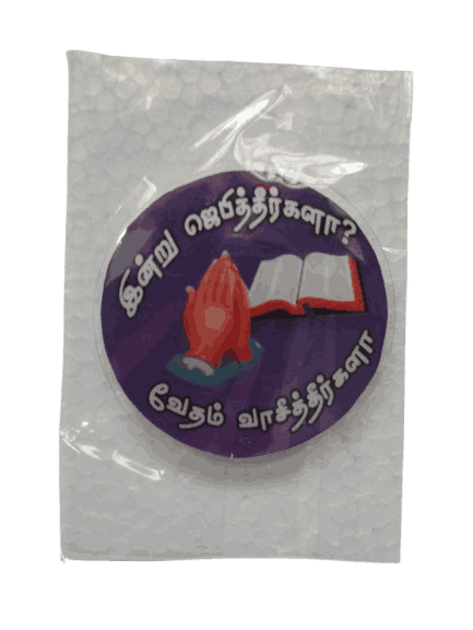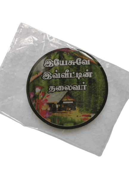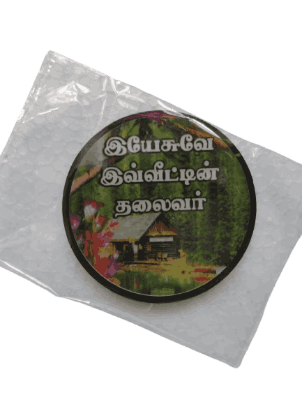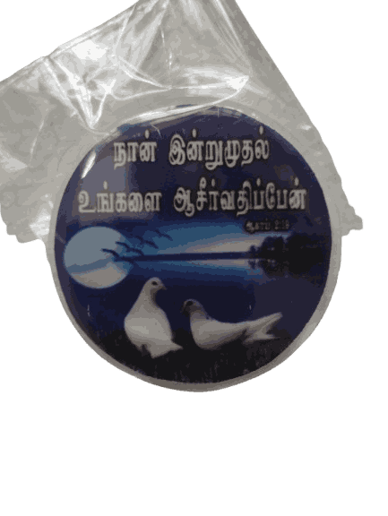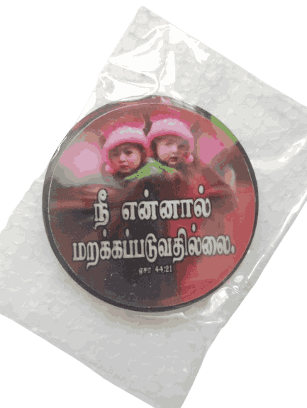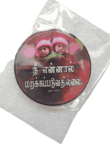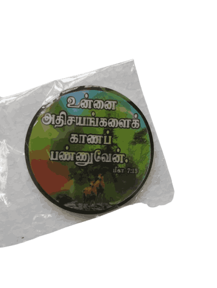 Circular Tamil Bible verse magnet – a small but powerful reminder of God’s promises.