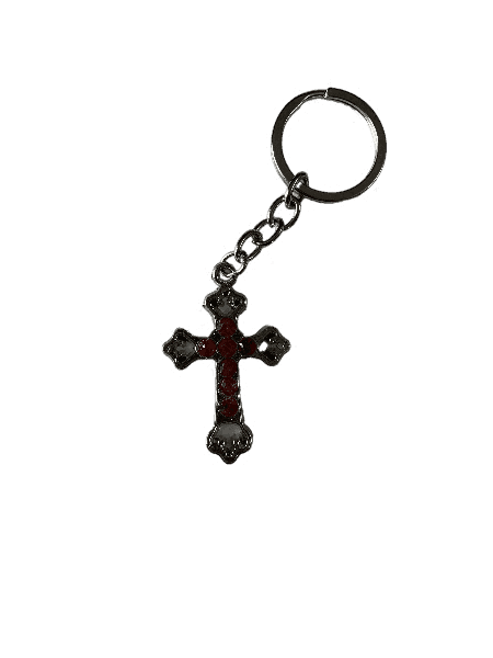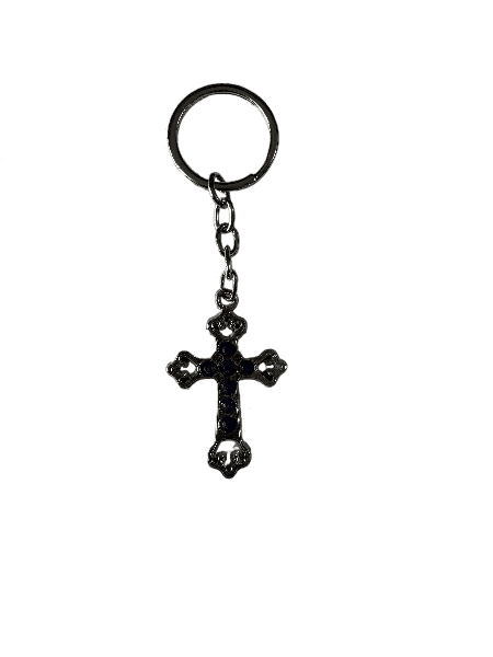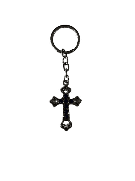 A stunning Holy Cross Keychain made of metal and adorned with stones, perfect for carrying your faith everywhere or gifting to loved ones.