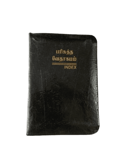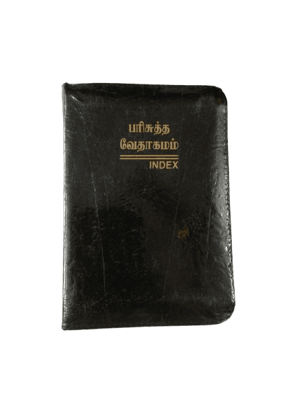 Compact Tamil Bible in Pilot Size with black cover and thumb index for easy navigation.