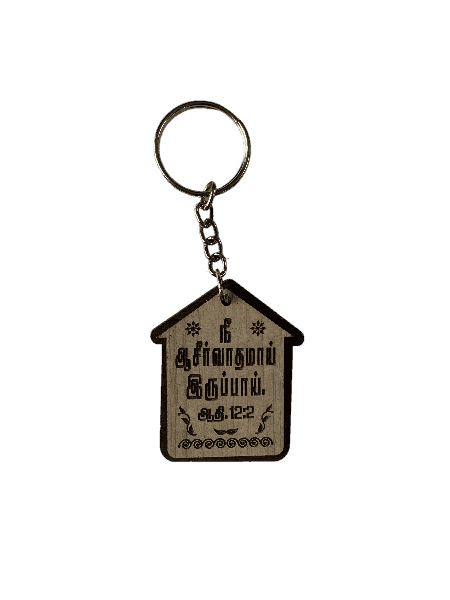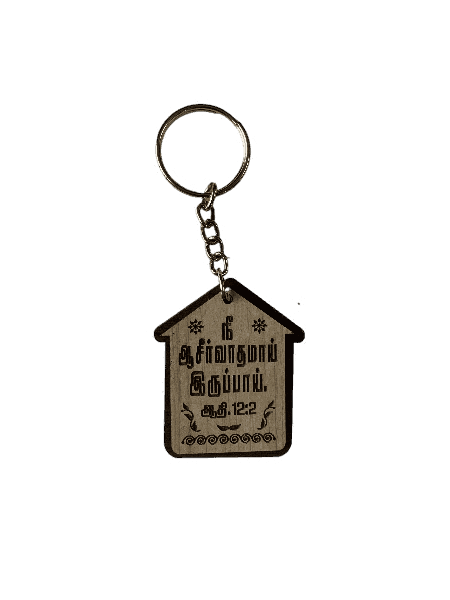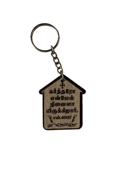 A House-Shaped Wooden Keychain with a Bible verse and Holy Cross, symbolizing faith and God’s protection—ideal for gifting or personal use.